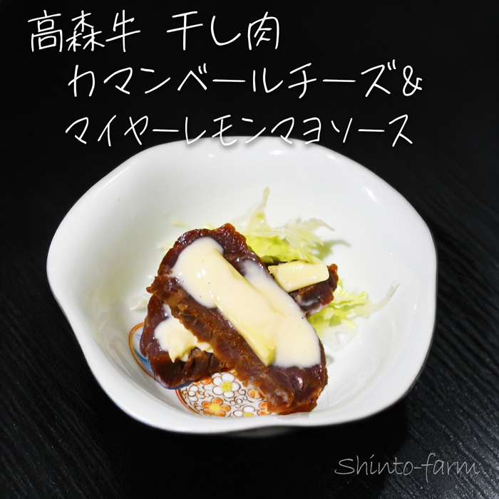 高森牛の干し肉をスライスしてかるくあぶり、チーズをのせてマイヤーレモンマヨソースを添えてお召し上がりください